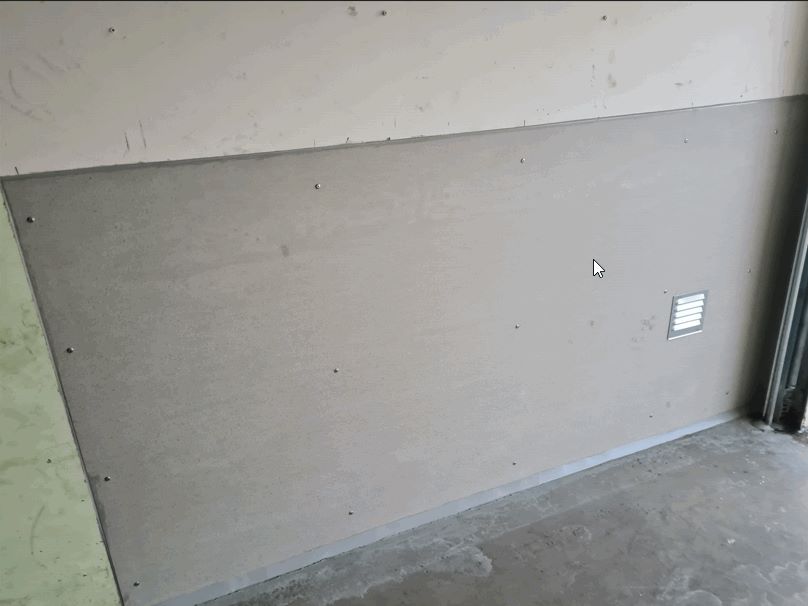 • Rivning av skivor i mellanvägg och montage av nya Cembrit Multi Force skivor (samma typ av skiva som monterats i några garage under tidigare renovering). Skivorna monteras i reglar som monterats i mellanväggen.